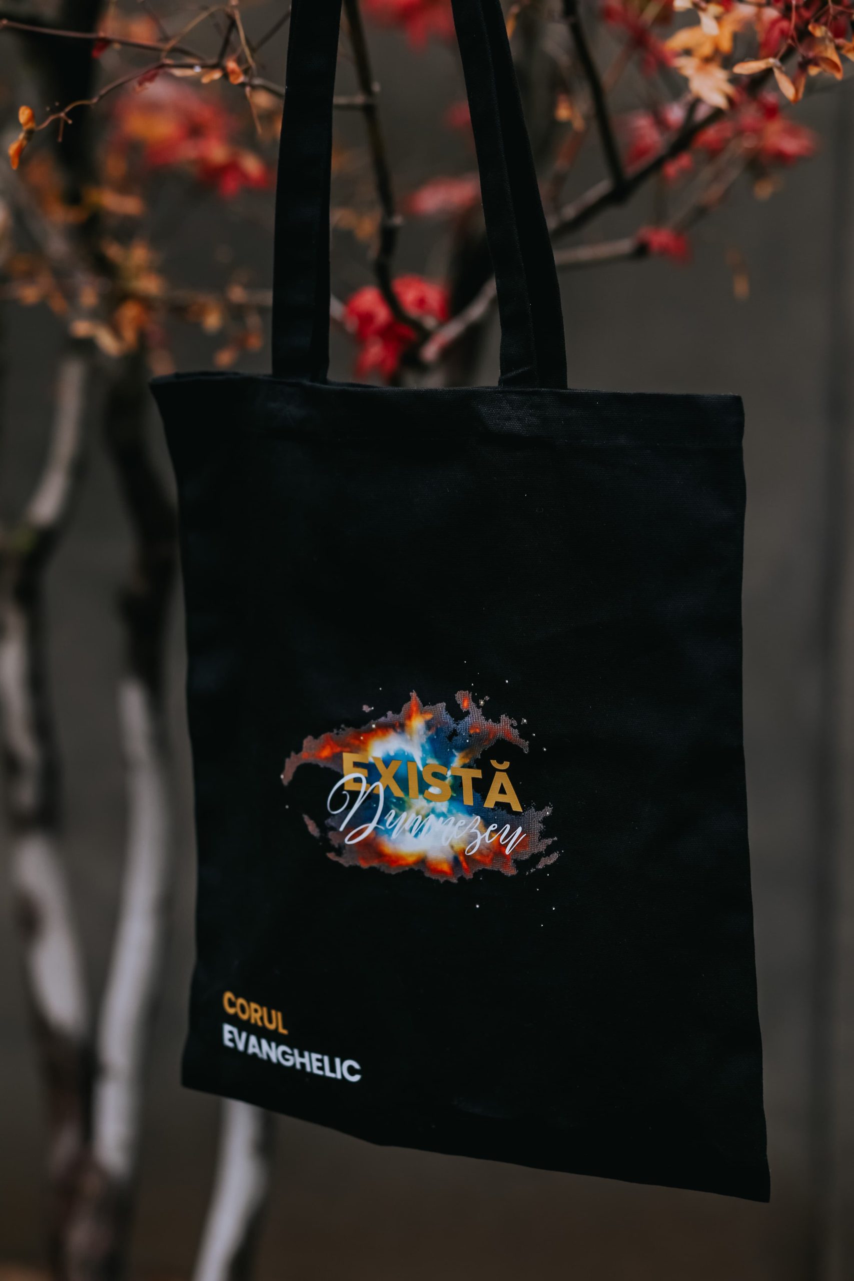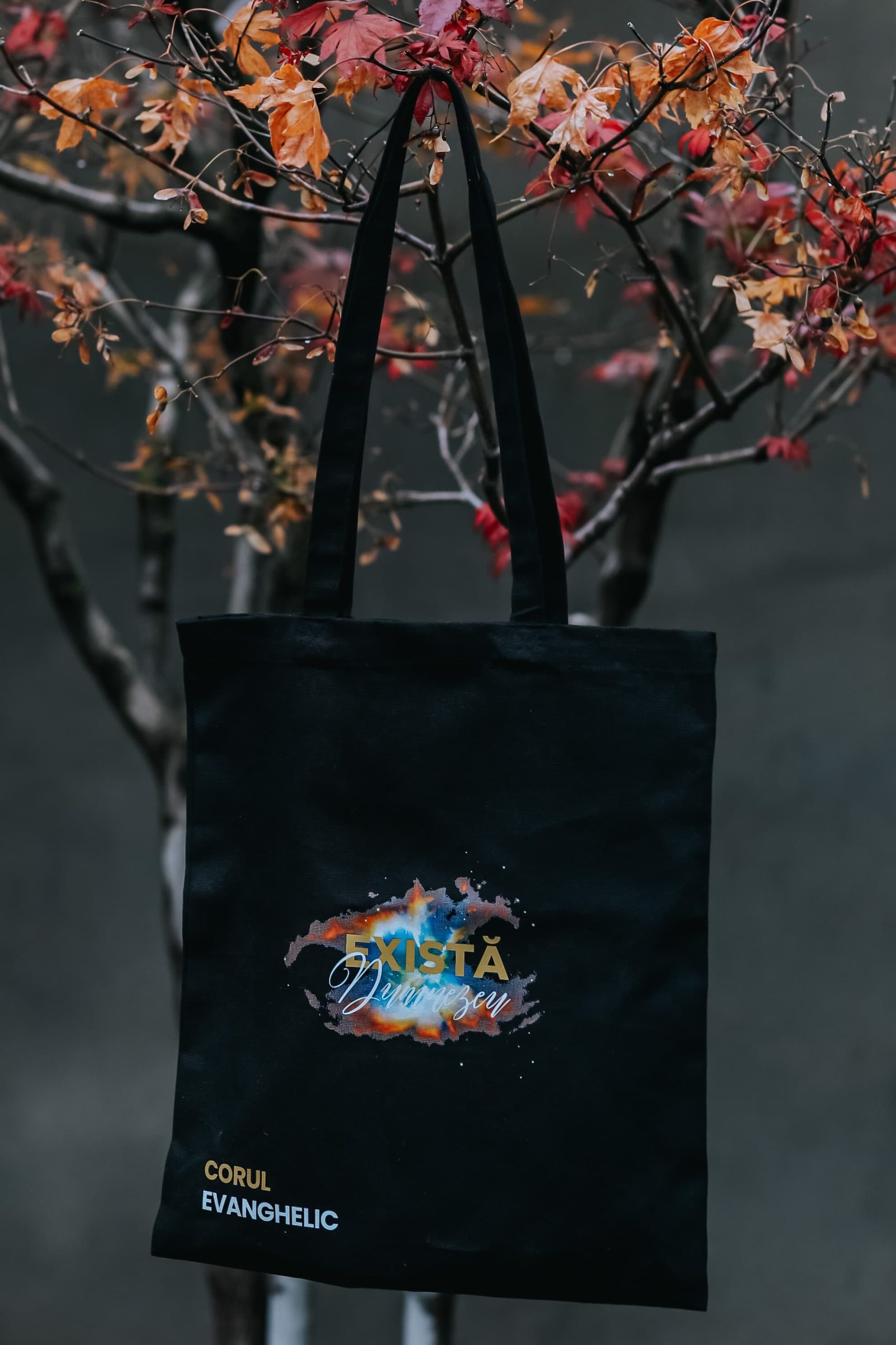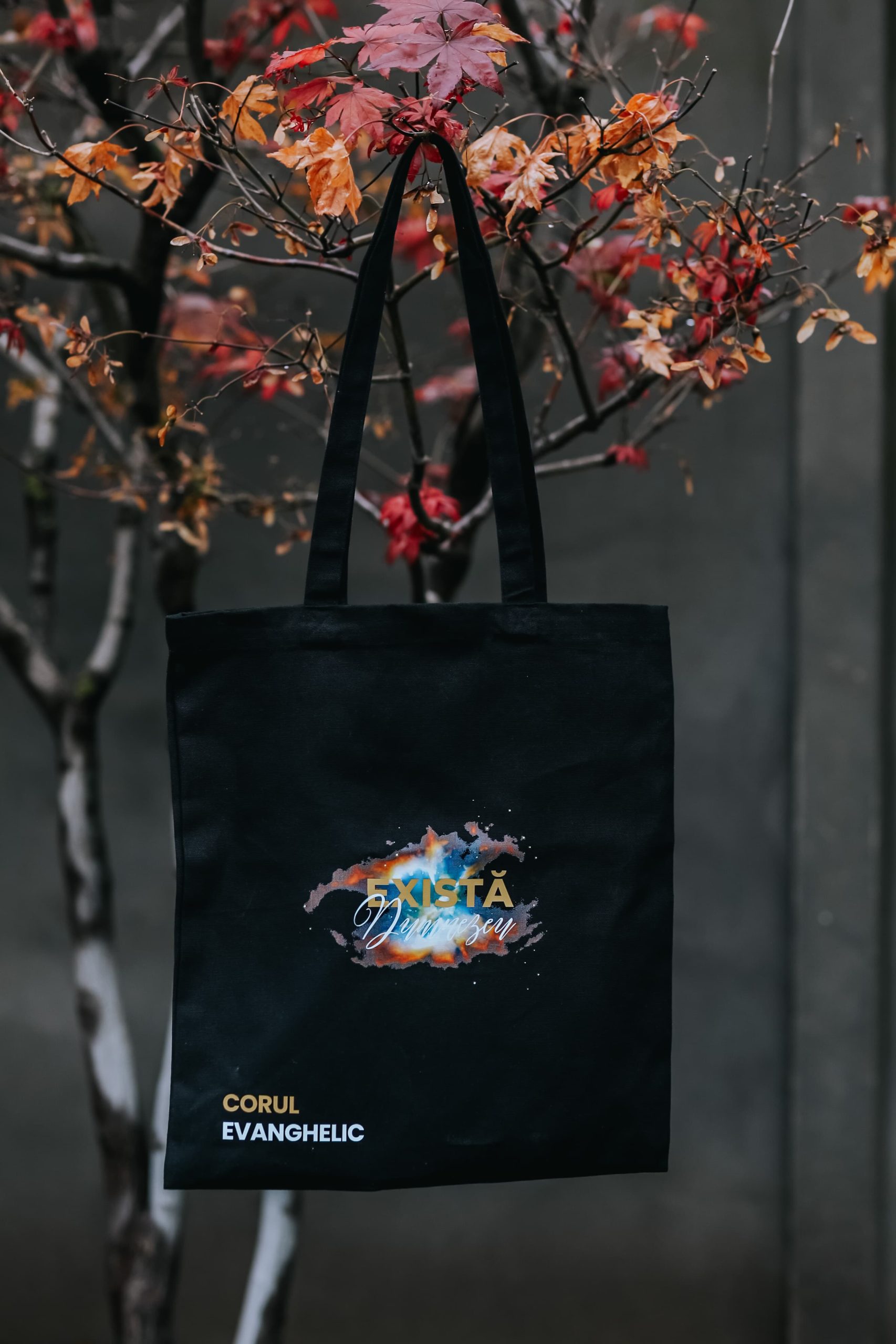Sacoșă bumbac organic (negru) – „Corul Evanghelic – Există Dumnezeu”